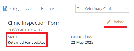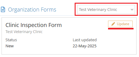 Clinic selection and “Update” button location in the Organization Forms section. Ensure the correct clinic is selected before clicking “Update” to begin.